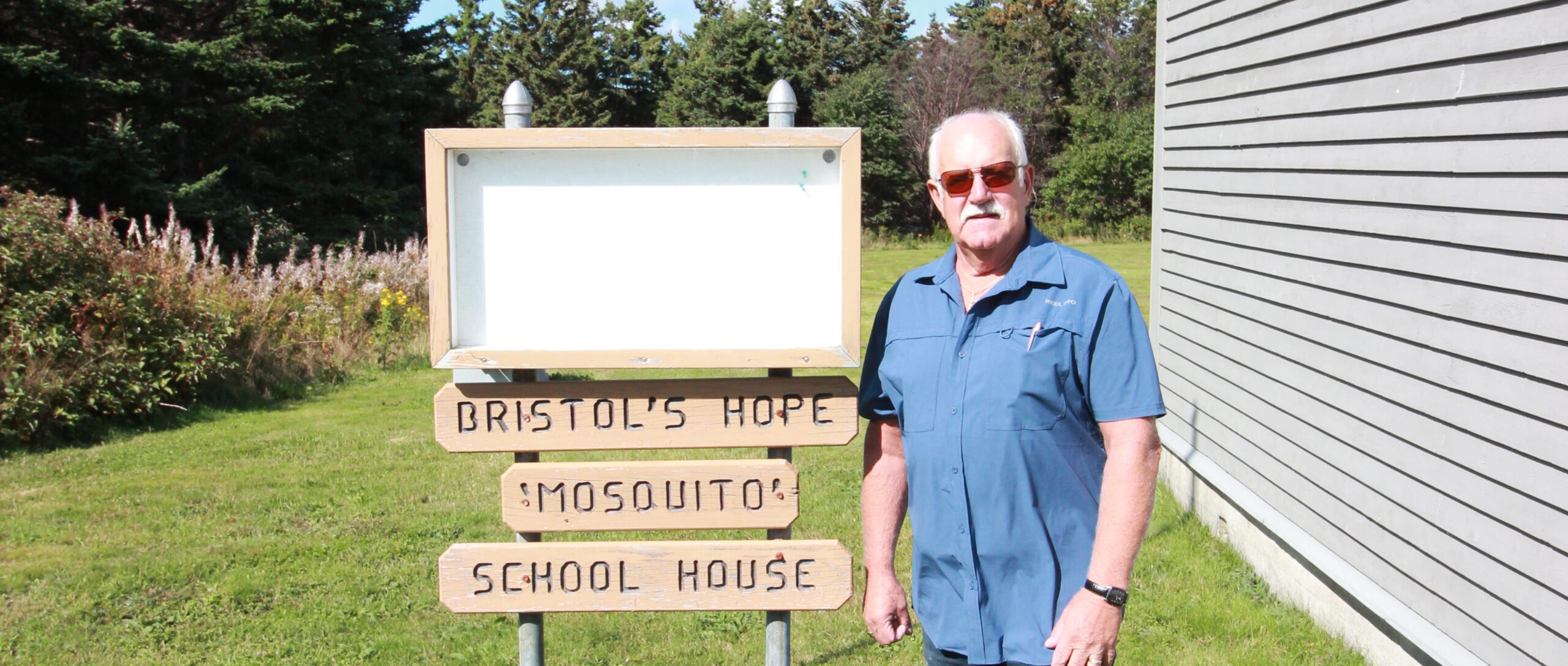 Richard and the Sign 2 Richard Johnson stands with the sign marking the Mosquito Schoolhouse in Bristol’s Hope. Emma Peddle