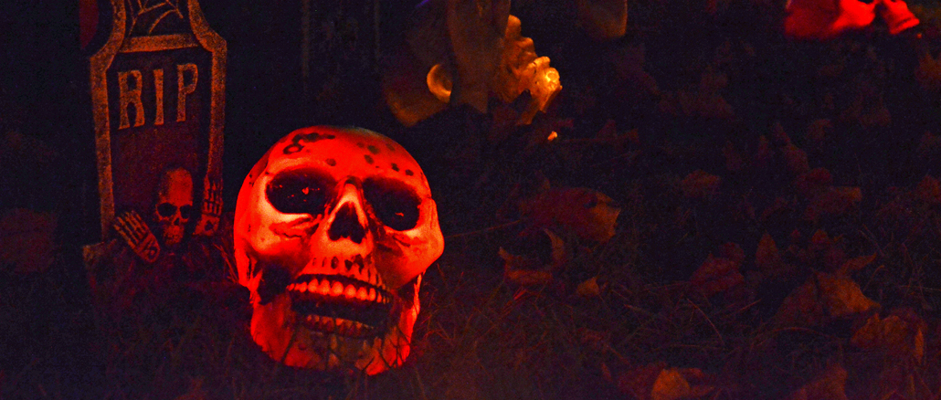 A Lawn is covered in Halloween decorations. Including a graveyard with a gray coloured tombstone and a glowing red skull next to it.