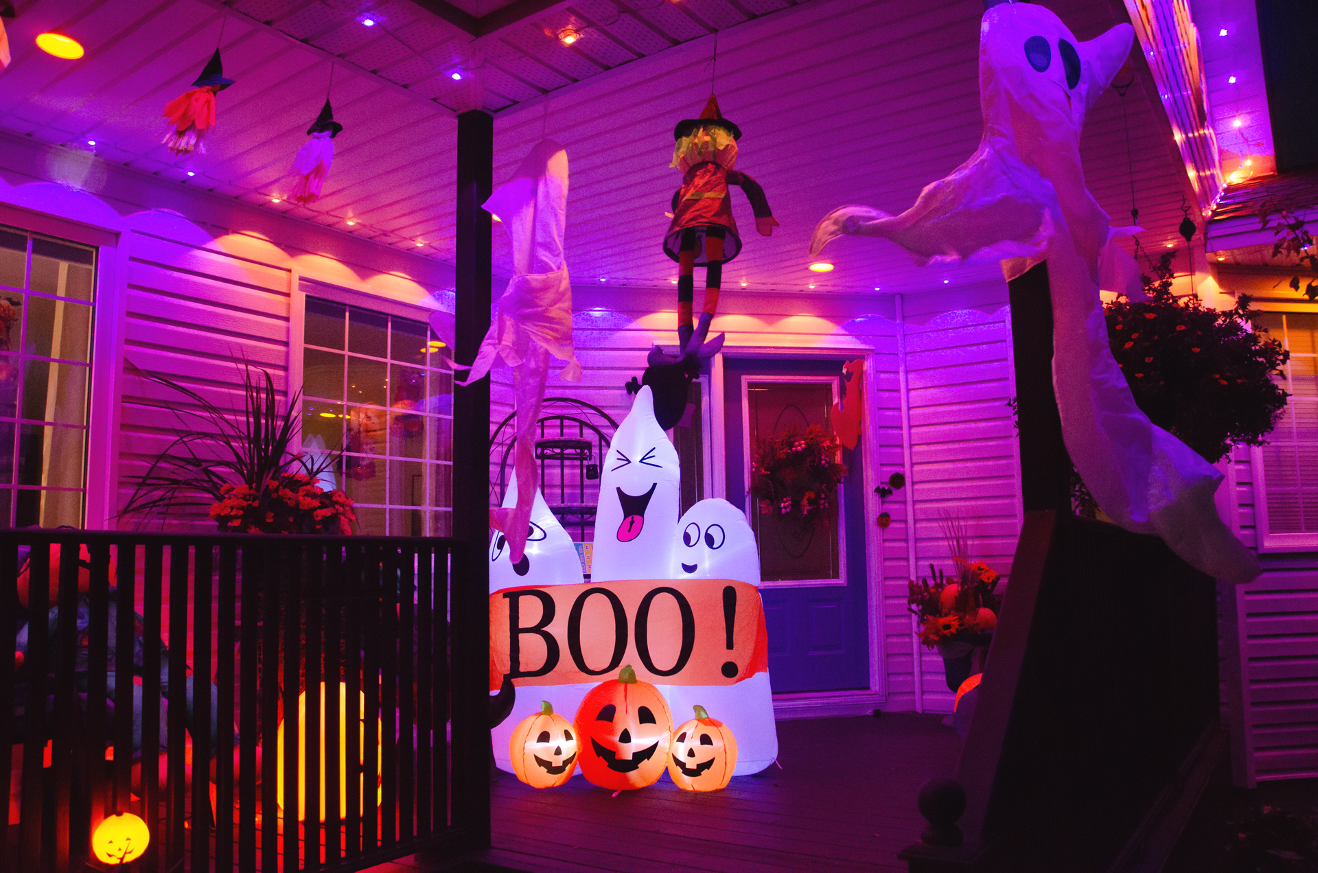 A house is covered in Halloween decorations. The home is lit up in orange and purple lights with inflatable ghost decorations.