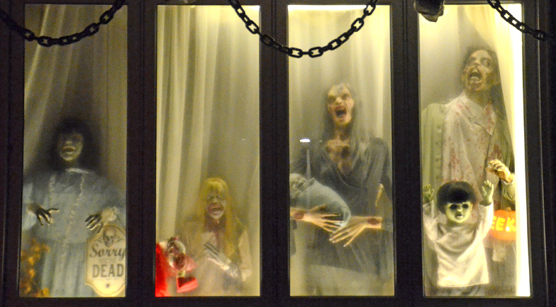 MWHalloweenPicFeatureEdited2 These ghosts and ghouls might fuel nightmares. Lorna Froude calls them her family. A display of Halloween decorations – a family of skeletons in the window of a house.