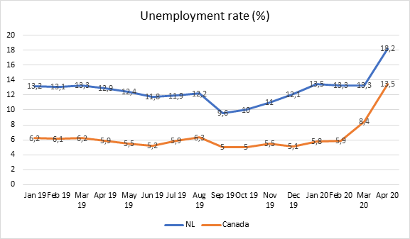 Unemployment numbers have risen since the spread of the pandemic to Canada. Unemployment went up by 5.1 percentage points nationally and 4.9 percentage points provincially. Source: Newfoundland and Labrador Statistics Agency