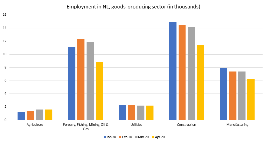 image-5 Between March and April 2020, 7,000 jobs were lost in the goods-producing sector. Forestry, fishing, mining, oil and gas was the hardest-hit industry. Source: Newfoundland and Labrador Statistics Agency