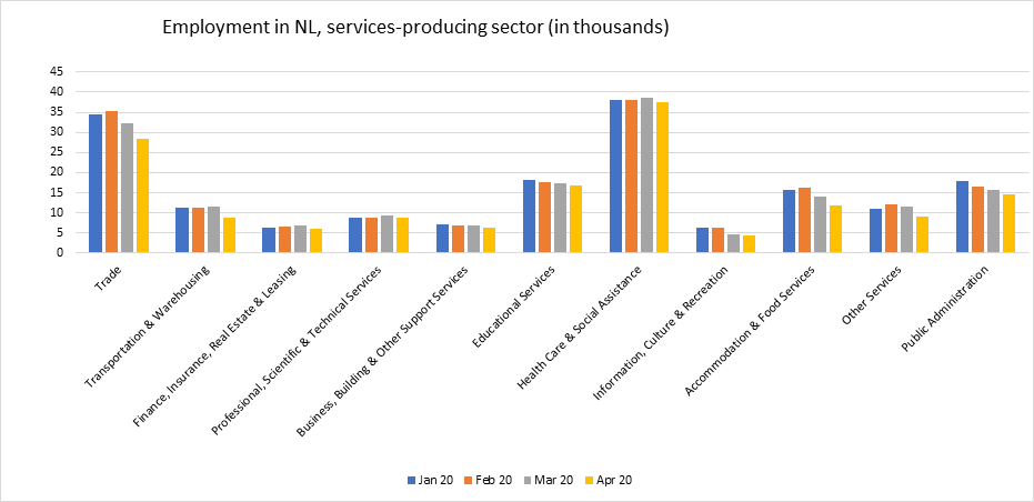 In the services-producing sector 16,300 people lost their jobs from March to April 2020. However, industries like educational services or health care and personal assistance were barely affected. Source: Newfoundland and Labrador Statistics Agency